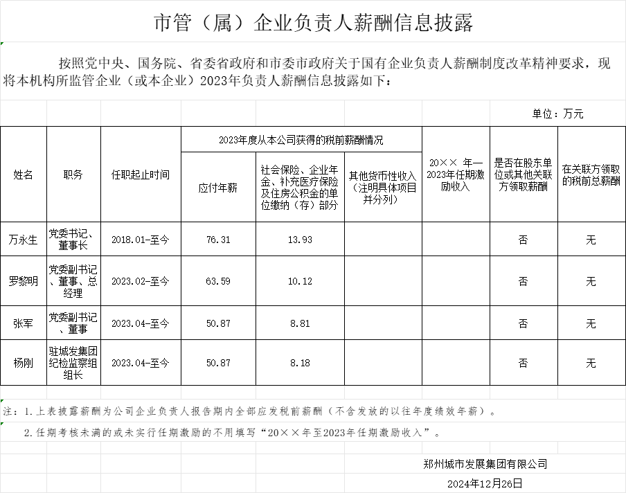 鄭州城市發(fā)展集團有限公司2023年企業(yè)負責人薪酬情況