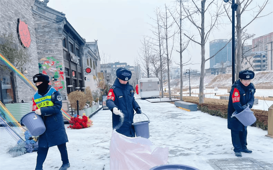 為保障亳都·新象街區(qū)安全運(yùn)行,商都發(fā)展公司提前部署應(yīng)對舉措。備足除雪物資,組織物業(yè)連夜掃雪除冰;通過商戶群、街區(qū)循環(huán)廣播推送防寒防凍、防滑提醒;安排工程人員對設(shè)施設(shè)備做足保溫防護(hù),全方位排查隱患,為商戶與市民筑牢安全屏障。